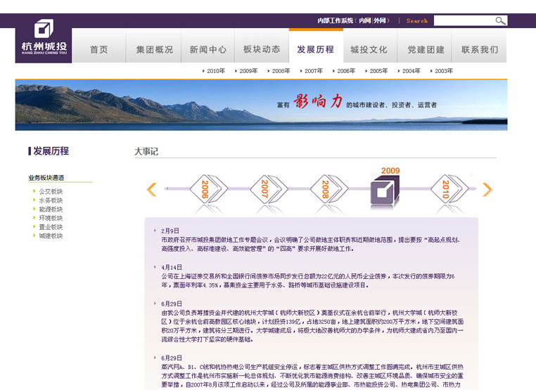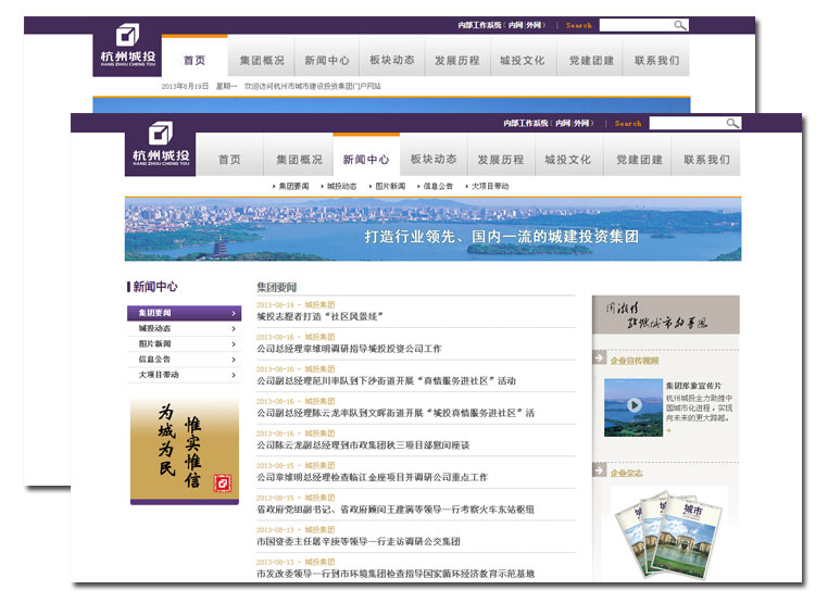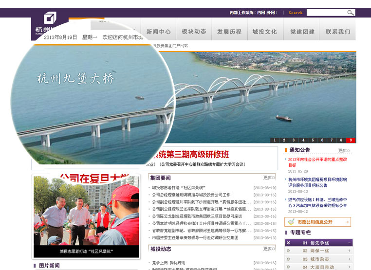 上海市城市建设投资集团有限公司成立于2003年,直属于上海市人民政府,注册资本65亿元。目前集团已发展成为拥有公共交通、城市水务、城市能源、城市建设、城市环境、置业发展六大经营板块23家下属企业、合并资产总量800多亿元的巨型企业航母。 为建立良好的集团网络形象,杭州城投邀请浩军为其设计全新的网站建设方案。